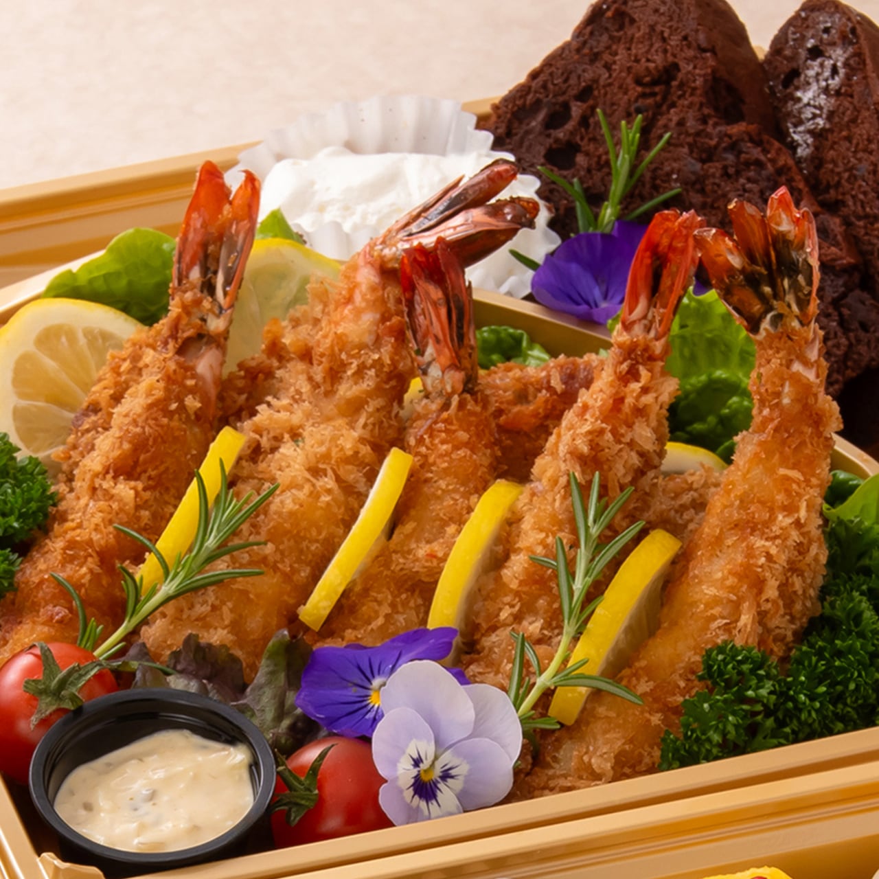 ホタテのソテーやエビフライ、カモロース、キッシュなど、洋風の人気メニューを彩り豊かに盛り合わせた手作りオードブル。